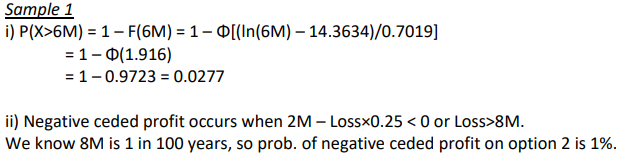 The ceded premium is 25% of 10million = 2.5million but we receive back a 20% ceding commission on this = 500,000. So the ceded premium net of ceding commission is 10m*(25%)*(1-20%) = 2m. From here we can solve for the breakeven X and then find the associated probability.