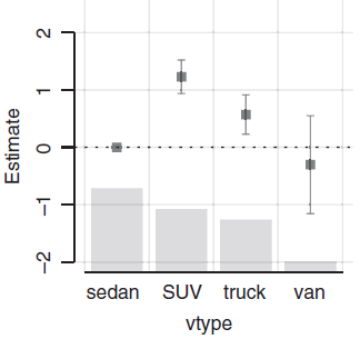 The base level for the vehicle type variable was chosen to be "sedan". The confidence interval for "van" crosses 0 which is the estimate for the sedan base level. So we reject at whatever significant level we're using the idea that vans and sedans have different behavior. Whereas for the SUV and truck vehicle type levels, the confidence intervals do not cross 0 so we assume the estimates for those are significant.