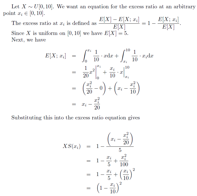 Here's a hint: The excess ratio is (E[X] - E[X; xi]) / E[X]. For a uniform distribution on [0, 10], E[X] = 5 so we just need to find an expression for E[X; xi].