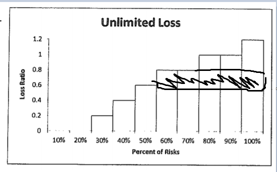 "Now calculate the expected excess loss using the chart by adding up the pieces of the bars that exceed the 60% expected loss ratio for the chart but are limited by the 80% loss ratio at maximum premium"
