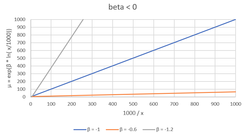 Then ln(mu) = b* ln( AOI / AOI_B ) which becomes mu = (AOI / AOI_B)^b = (AOI / AOI_B)^(-|b|) = (AOI_B / AOI)^|b| = c * AOI^(-|b|) where c = AOI_B ^|b| is a positive constant.