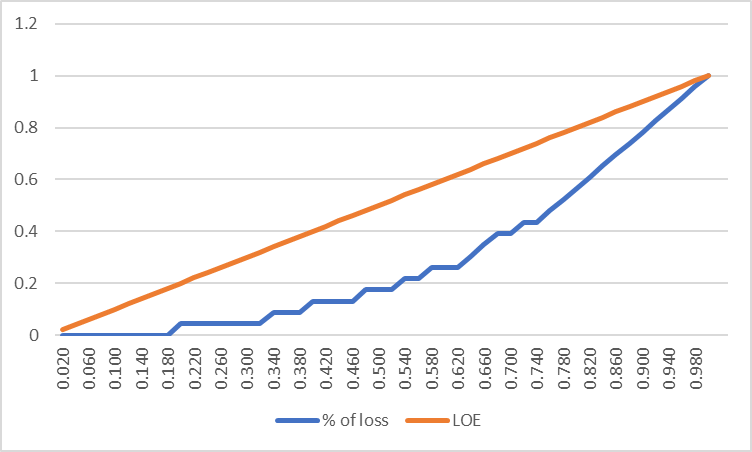 Thank you! Yes that was clear. I ended up translating the true=1, false=0 and then cumulating % of loss (after sorting) = 0 or 1 /23 (total losses) and ended up with the same numbers and graph that looked reasonable: