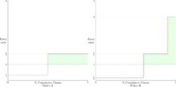 [[File:LeeDiagramsFig18.png|left|thumb|250px|Figure 3]]Using a representative sample of 10 policies of each type, we can draw the pair of Lee diagrams seen in Figure 3. We see Policy B the insurance charge at entry ratio 1 is 0.5, whereas for Policy A it is 0.333. The severity distribution for Policy B has greater variance than the severity distribution for Policy A, and we note there are no differences between the policies in terms of claim frequency. | |||