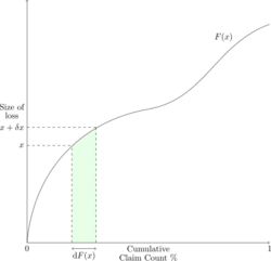 Figure 3 below generalizes this idea to the continuous case where a small change in cumulative probability, dF(x), corresponds to losses of size between x and x + δx. Then the vertical strip represents xdF(x) which is the expected loss of the strip. Summing these infinitely small strips gives the expected value [math]E[X]=\displaystyle\int_0^\infty x\mathrm{d}F(x)[/math]. Observe F(x) goes from 0 to 1 but dF(x) goes from 0 to [math]\infty[/math] because to change F(x) we must move the underlying loss between 0 and positive infinity.