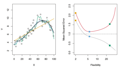 Figure 1 below is an excellent illustration of this from "An Introduction to Statistical Learning" [1]. The black line in the left graph is a known "true" function (the signal) that is sampled with error (black circles). The sample data is split into train and test data sets then different models are fit to the training data such as a linear regression and two splines with various degrees of freedom. The graph on the right plots the mean squared error (MSE, a measure of model fit) against the model degrees of freedom (more freedom = higher flexibility) and the three models from the left graph are shown by colored squares. By comparing the test curve (in red) with the graph on the left, we see why the highest degrees of freedom model (green curve) has a low train MSE (grey curve) but a high test MSE — it fits the training data well but doesn't follow the signal well because the green curve wiggles too much as it tries to conform to the training data as closely as possible, i.e. the green model is overfit.