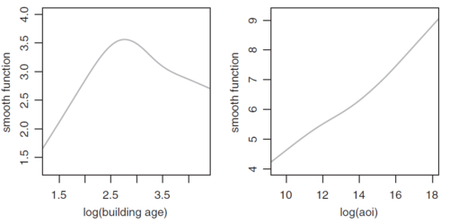 The text does provide the following illustration of a GAM. The left panel of Figure 2 below shows the GAM output for log(Age of Construction). This can be compared to Figure 3 below which shows the GLM output for log(Age of Construction) when the modeler manually used one (left panel) or two (right panel) hinge functions to produce a piecewise linear estimation. The GAM captures the effect with greater ease and smoothness.