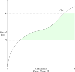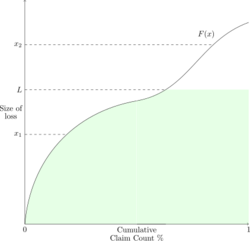 Figure 4 below is a Lee diagram when there is a per-occurrence limit L on the policy. The shaded area represents the expected payment per loss because the horizontal axis is the cumulative claim count percentage.