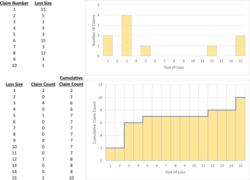 Figure 1 below shows the more traditional way of viewing a sample of 10 claims. Notice how in the second part of the figure we've ordered the claims by loss size and added the incremental and cumulative counts. So here x1 = 1, x2 = 2, ..., x15 = 15 and n1 = 2, n2 = 0, ..., n15 = 2, and n = n1 + ... + n15 = 10.