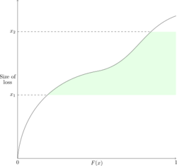 Figure 3 below generalizes this idea to the continuous case where a small change in cumulative probability, dF(x), corresponds to losses of size between x and x + δx. Then the vertical strip represents xdF(x) which is the expected loss of the strip. Summing these infinitely small strips gives the expected value [math]E[X]=\displaystyle\int_0^\infty x\mathrm{d}F(x)[/math]. Observe F(x) goes from 0 to 1 but dF(x) goes from 0 to [math]\infty[/math] because to change F(x) we must move the underlying loss between 0 and positive infinity.
