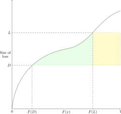 Returning to the idea of a policy with a per-occurrence deductible D and per-occurrence limit L we observe the layer method gives [math]E[X]=\displaystyle\int_D^L S(x)\mathrm{d}x[/math] relatively easily (see Figure 10). Yet to calculate this using the size method we have to compute and add together the green and yellow shaded areas in Figure 10. This area may be expressed using the survival function as [math]E[X]=\displaystyle\int_{F(D)}^{F(L)}x\mathrm{d}F(x) - D\left[S(D)-S(L)\right]+\left(L-D\right)S(L) = \displaystyle\int_{F(D)}^{F(L)}x\mathrm{d}F(x) -DS(D)+LS(L)[/math]. You arrive at the same result if you think in terms of F rather than S but the algebra is a little more involved.