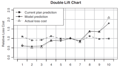 Figure 2 below is also from the GLM text. It shows a double lift chart which compares the current rating plan to a new model (though you can compare any two models). The new model is represented by the solid line and it tracks the actual data (dotted line) much more closely than the current model (dashed line) which suggests the new model is better than the current plan.