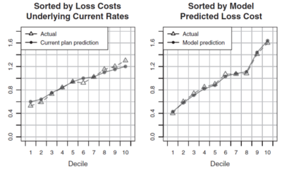 Figure 1 below is directly from the GLM text. It shows two quantile plots, each with 10 deciles, that are used to compare the performance of the current rating plan against the new model. Applying the three criteria above we deduce the new model has greater predictive accuracy because its model predictions track the actual values more closely than the current plan values do. Similarly, observe the current plan has a reversal in its 6 th decile whereas the new model has no reversals. Lastly, the vertical distance between the first and last decile is much greater for the new model than the current plan. Hence, under all three measures the new model outperforms the current plan.