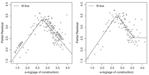 The text does provide the following illustration of a GAM. The left panel of Figure 2 below shows the GAM output for log(Age of Construction). This can be compared to Figure 3 below which shows the GLM output for log(Age of Construction) when the modeler manually used one (left panel) or two (right panel) hinge functions to produce a piecewise linear estimation. The GAM captures the effect with greater ease and smoothness.