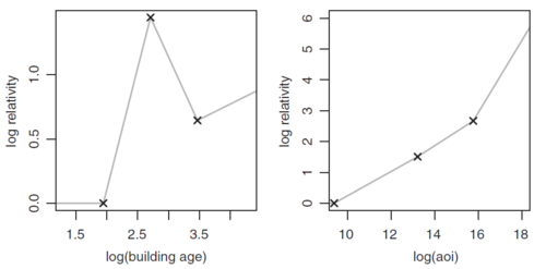 Important! For a refresher on hinge functions in general, click here. A key difference between the MARS output in the above example and the general hinge function output is the lack of a log(AoC) or log(AOI) row. This means the AoC response curve for the model is flat below 1.94591 which by exponentiating translates to a flat curve for buildings under 7 years old. Similarly, though less material, the AOI response curve for the model is flat below [math]e^{9.39124}[/math], i.e. flat for amounts of insurance less than about $12,000. Figure 5 below illustrates the response curves with an X shown at each break point.