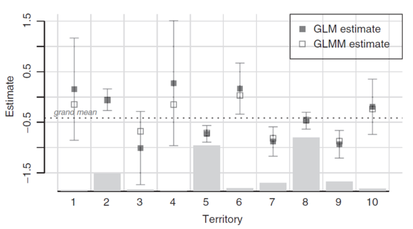 Figure 1 below is from the text. It contrasts GLM and GLMM output for a territory variable with 10 levels. The light grey bars show the volume of data within each territory. The solid boxes and confidence intervals show the standard GLM coefficients and associated 95% confidence intervals. Lastly, the unfilled boxes show the GLMM coefficients and the horizontal dotted line represents the grand mean. The key takeaways are: