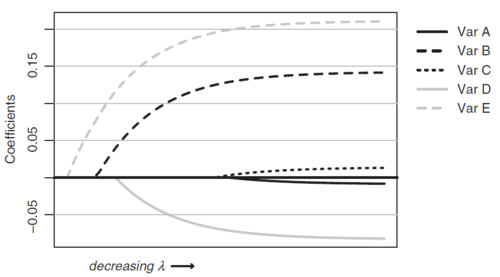 The GLM text includes Figure 6 below to illustrate how increasing the severity of the penalty term results in variables being removed from the model. The earlier a variable starts showing non-zero coefficients as [math]\lambda[/math] goes towards 0, the greater the significance of that variable. In Figure 6, variable E is the most important, followed by B then D.