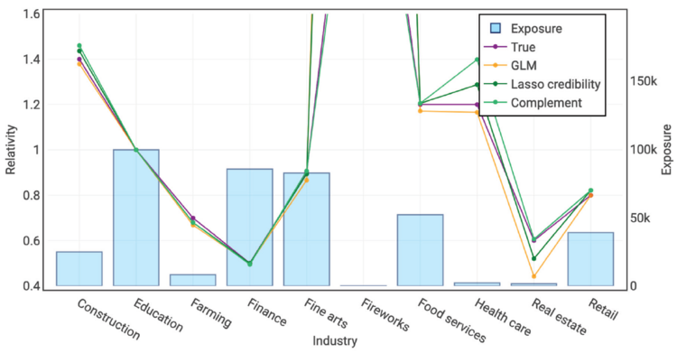 With lasso credibility, categories should be at least as granular as the chosen complement of credibility because when a category is insignificant it will have its coefficient reduced to zero so we pick up the complement relativity. This removes the need to group non-credible categories. In contrast, in a GLM we must manually group insignificant levels with the base level and refit the model to obtain stable coefficients.