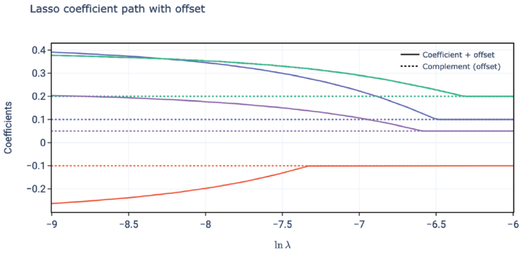 The default offset assumption is the offset coefficients are zero. When all offset coefficients are zero we are performing lasso regression rather than lasso credibility. When performing lasso credibility we should use the default offset assumption when we have no prior knowledge of a variable's effect on risk, and include an appropriate complement when we have suitable knowledge.